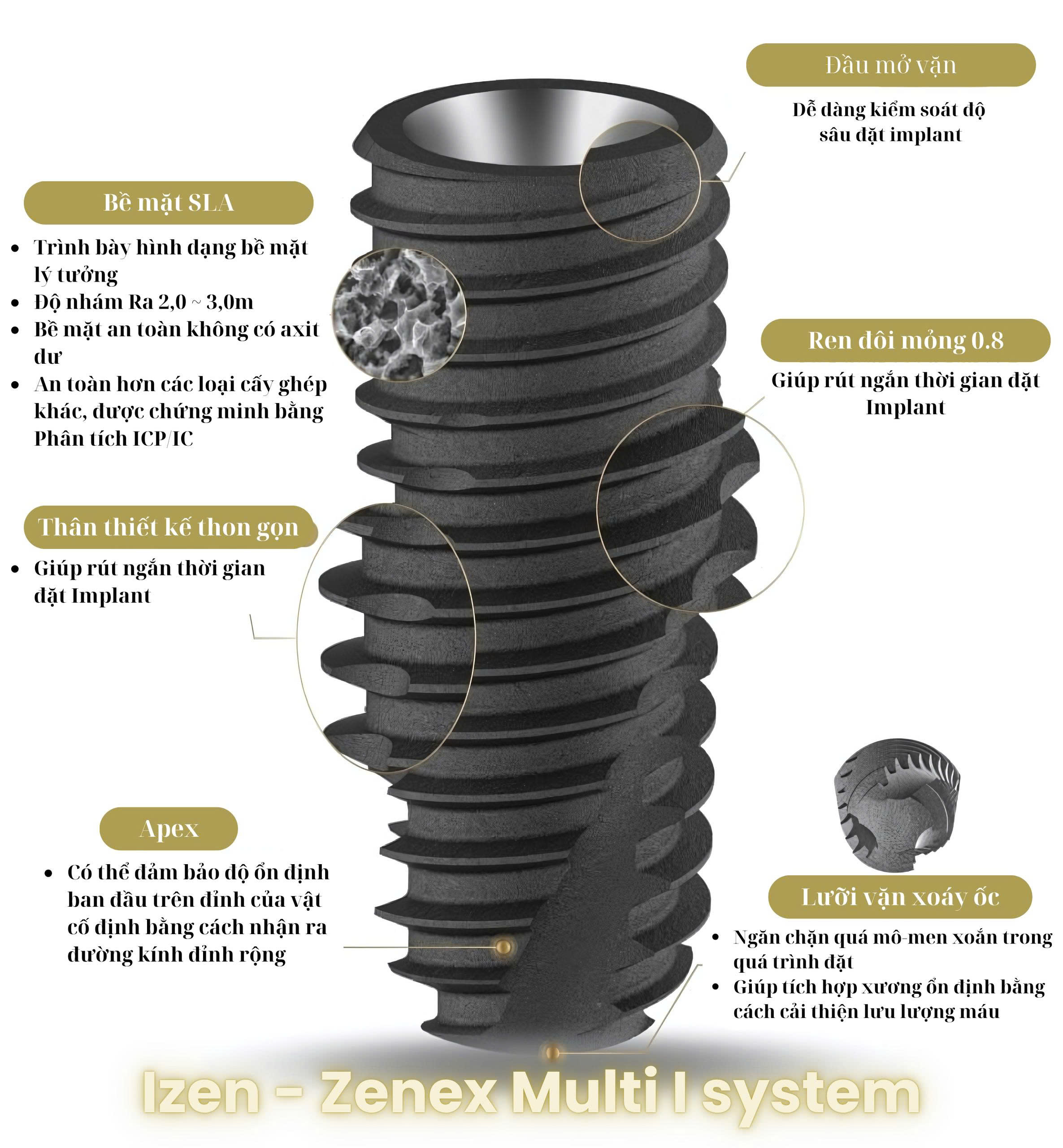 Bề mặt xử lý Bề mặt được xử lý (SLA, RBM, SA, nano-surface…) để tăng khả năng tích hợp xương.